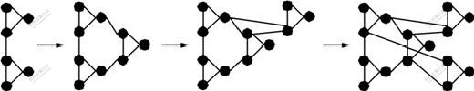 After t time steps, the model leads to a random network with N=(t+m0)m1 vertices and mt edges. Fig.1 shows the evolving process of the model (Only to illustrate the evolving procedure, in the later simulation, we used other value of the parameters). The initial network has two cliques, and every clique has three vertices. At every time step we added a new clique with two edges that link the new clique to two different cliques already present in the network by the mechanism of preferential attachment.