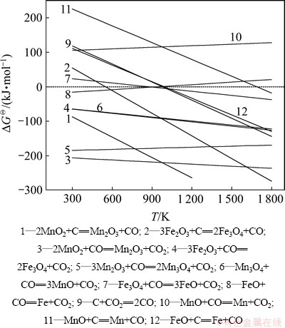 图4所示为高铁锰矿直接还原热力学分析结果。MnO2、Fe2O3和无烟煤发生固相反应,还原为Mn2O3和Fe3O4,产生CO气体。CO与锰氧化物和铁氧化物反应,将MnO2和Fe2O3逐级还原为Mn2O3,Mn3O4,MnO,Fe3O4和FeO、金属Fe,产生CO2气体;CO2和固定碳进行布多尔反应,使铁锰氧化物不断还[13-14]。CO将MnO2还原为MnO较为容易,但MnO不能被CO还原为金属锰,只能通过碳直接接触还原成金属锰,反应开始温度为1 693 K。已有研究表明[15]:有金属铁存在时,还原出来的铁与锰组成锰铁的二元碳化物[(Mn·Fe)3C],从而大大改善MnO的还原条件,在温度接近1 373 K时,MnO的还原即可以进行。