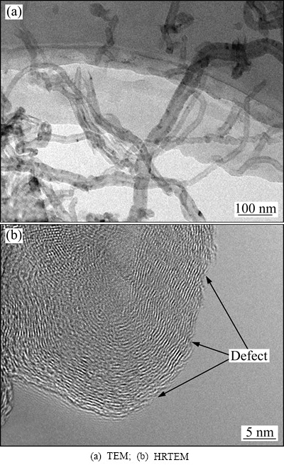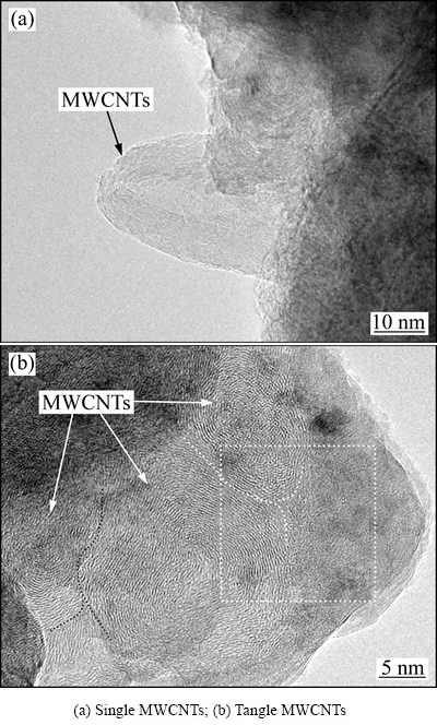 图8所示为经5道次FSP后分布在基体中的MWCNTs。IEADI等[14]发现经多道次FSP后,MWCNTs会受到一定程度的损伤,其多壁结构转变为具有球型外壳的碳结构。图8 (a)所示为单根MWCNTs穿插在镁基体中,MWCNTs端头及侧身的多壁结构清晰可见,且保持完好。这说明经5道次FSP后,MWCNTs在径向上的多壁结构并未受到机械损伤,能够稳定地存在于基体中。图8(b)所示为相互缠结在基体中的MWCNTs,其形成原因主要有以下两个方面:一方面,由于原始态的MWCNTs纯度只有98%,其中2%的杂质包括非晶碳、无定性碳、碳纳米粒子和催化剂粒子等。这些杂质粒子的存在,容易引起MWCNTs的团聚,使碳纳米管不易分散;另一方面,由于添加的MWCNTs体积分数较高,在FSP过程中MWCNTs未能得到充分分散,这在搅拌摩擦加工过程中是无法避免的。此外,从图8 (b)中可见,MWCNTs在长度方向上垂直纸面排列,其结构为界面分明且完整的多壁结构,由此证明MWCNTs在微区内具有一定的定向排列,这能够提高CNTs对基体的强化作用。
