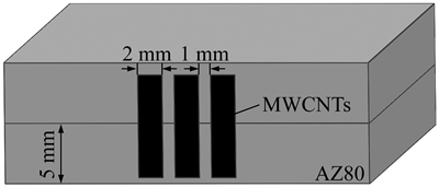 目前,已开展的关于MWCNTs增强镁基复合材料的研究主要集中在复合材料的制备工艺及性能测定等方面,所制备的复合材料的MWCNTs体积分数不高于10%,未能充分发挥碳纳米管和镁合金固有的轻质高强特性。MORISADA等[13]利用FSP法并采用在试板上开槽的方式制备了成形良好的MWCNTs/AZ31复合材料,且MWCNTs分布均匀,显微硬度较母材有显著的提高。MORISADA等[13]还采用了开槽法制备复合材料,开槽的槽宽为1 mm、槽深为2 mm,但采用这样的凹槽尺寸只能用于材料的表面改性,无法获得大体积的复合材料。