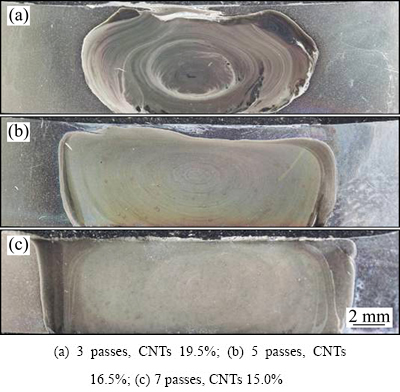 图4所示为经3、5、7道次FSP后复合材料的横截面宏观形貌。用Image-plus软件测试并计算得所制备的复合材料中MWCNTs体积分数分别为19.5%、16.5%和15.0%。由图4可见,随着加工道次的增加,复合区面积依次增大,MWCNTs体积分数随之减小,搅拌区组织逐渐均匀。