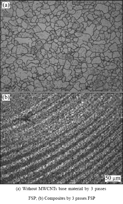 图5(a)所示为未添加MWCNTs 3道次FSP母材的显微组织形貌。由图5(a)可见,组织是较大晶粒和细小的动态再结晶晶粒混合组成,且分布不均匀。图5(b)所示为添加了MWCNTs 3道次FSP复合材料中心区形貌。由图5(b)可见,在同样的观察倍数下,无法看清晶粒的形貌,结合后面的分析可知,由于大量MWCNTs弥散分布于基体中阻碍了晶粒的生长,从而形成了更为细小的纳米晶。