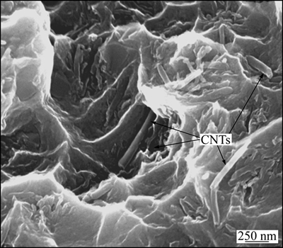 图6所示为经7道次FSP后复合材料的断口表面形貌。由图6可见,在复合材料的韧窝内和撕裂棱上存在MWCNTs的拔出或拔断的现象(见图6中箭头),经7道次加工后,MWCNTs与基体混合充分,MWCNTs在基体中的分散性均匀,其复合材料中的MWCNTs与基体界面结合最为紧密。