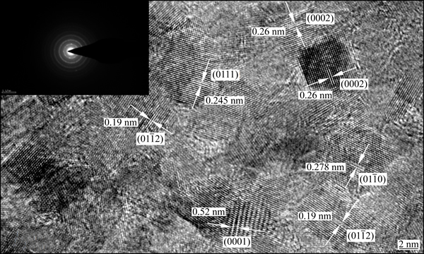 Fig. 7 HRTEM image of composites by 7 passes FSP (inset is corresponding SAED pattern)