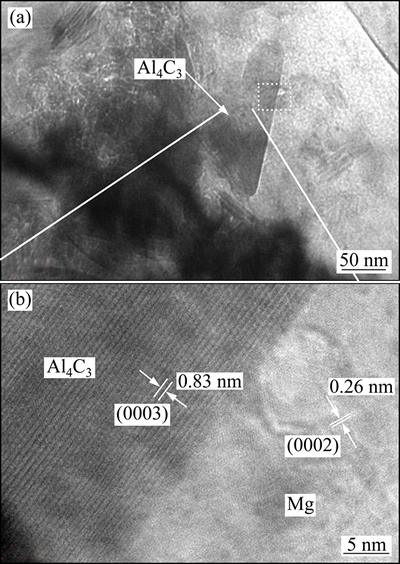 图9所示为经7道次FSP后复合材料的HRTEM像。从图9 (a)中可见,在基体中穿插着一根直径与MWCNTs直径相仿但长度相差甚远的“棒状”相,为了确定该相是否为MWCNTs,对其微区进行了放大,如图9(b)所示。图9(b)中左侧晶格条纹呈现平行排列,这与高分辨透射电镜下MWCNTs逐层卷曲排列的结构不符,由于MWCNTs在侧壁方向不会受到机械损伤.因此,可以断定该直纹相不是MWCNTs。通过测量图中直条纹间的原子间距可知,图9(b)中左侧晶面间距为0.83 nm,晶面指数为(0 0 0 3),成分为Al4C3化合物;右侧晶面间距为0.26 nm,晶面指数为(0 0 0 2),成分为基体镁。在整个界面区域没发现非晶层的存在,Al4C3相与镁基体之间为直接原子结合,且两相之间的界面光滑、平直,在二者的界面处没有发现其它杂质相。