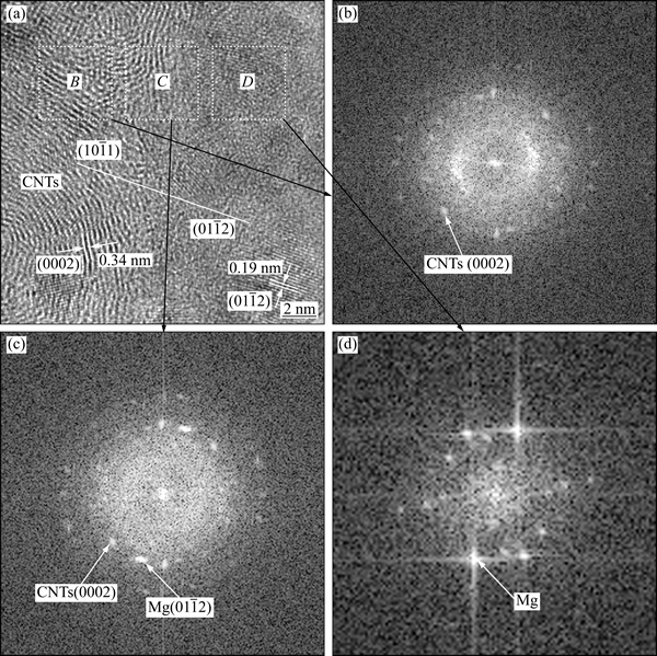 Fig. 10 HRTEM image of MWCNTs-Mg interface in Fig. 8(b) (a) and Fourier transform image of area B, C and D in Fig. 10(a), (b), (c), (d)