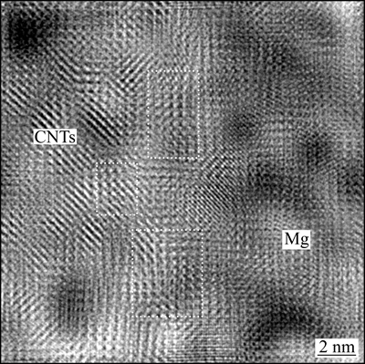 图11所示为图10(a)的傅里叶逆变换图像,由图11可以清楚地观察到,在虚线框区域内,MWCNTs与镁基体界面处的原子为直接结合,错配度较小,两者界面为半共格晶面,而在其他区域为非共格晶面,总体上呈现半共格相界,界面结合较为紧密。