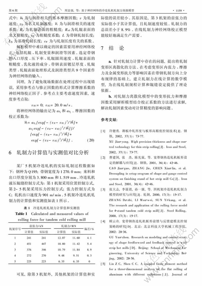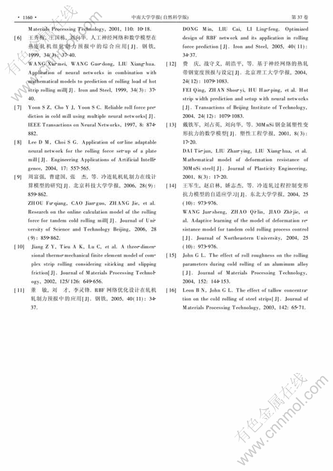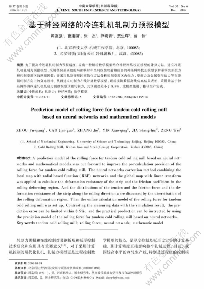 Key words:tandem cold rolling mill; rolling force; neural network; mathematic mode