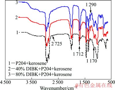 固定有机相中P204的浓度,以磺化煤油作稀释剂,采用不同体积浓度的DIBK有机相与相同的水相进行萃取,对负载有机相进行红外光谱分析,考察其红外光谱在500~4 000 cm-1波数范围内的变化情况,结果如图4所示。