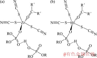 DIBK-P204体系对锆和铪协萃配合物的组成分别为Zr(SCN)3·HA2·DIBK和Hf(SCN)3·HA2·DIBK,则协萃配合物中锆和铪分别与5个配位体配位,形成5个配位键,从稳定化能的大小比较来看,可能形成正六面体结构[26],其可能的结构式如图6所示。图6中:R为乙基已基;R′为异丁基。而DIBK-TBP体系对锆和铪的协萃配合物有6 个配位键,形成更稳定的正八面体配离子。