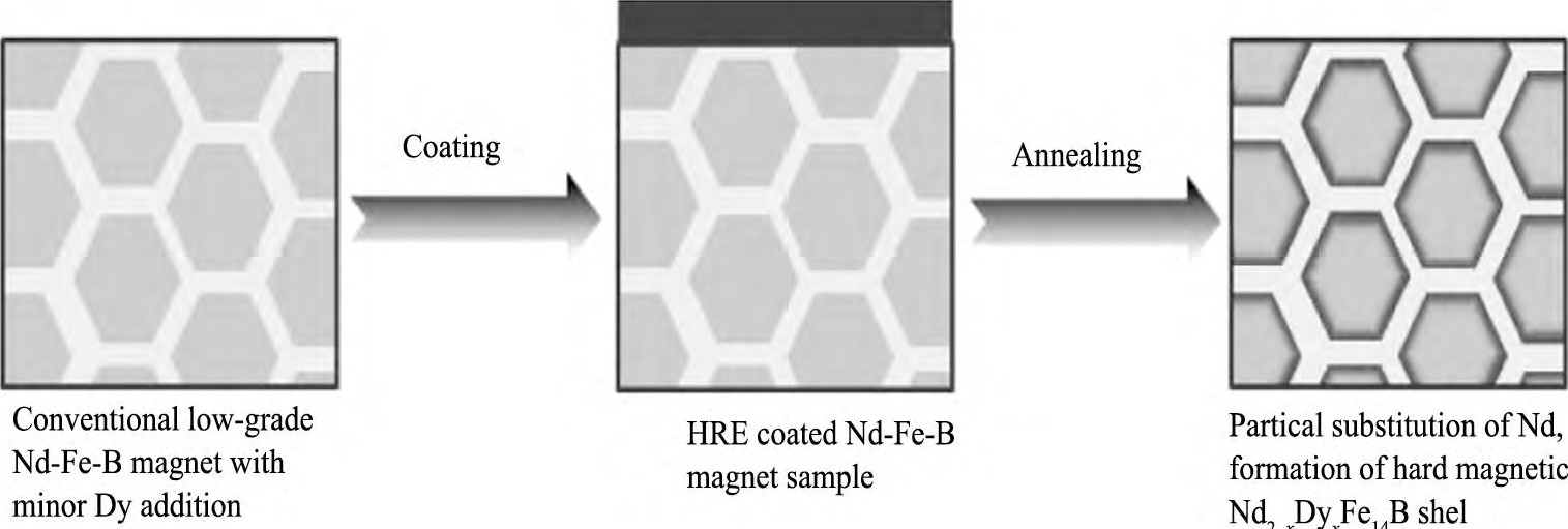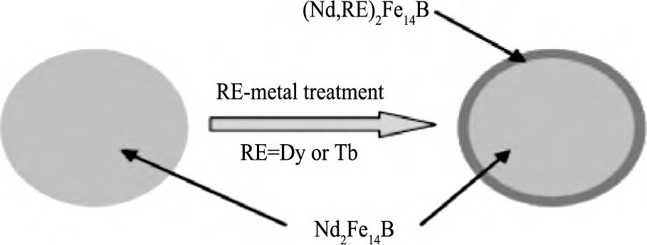 晶界扩散方法最早是针对薄型烧结钕铁硼磁体提出的, 以恢复或提高薄型磁体的矫顽力。然而, 随着高性能钕铁硼磁体需求的增加和重稀土资源的紧缺, 晶界扩散方法引起了人们的广泛关注。通常, 晶界扩散方法是在烧结后的钕铁硼磁体表面附着一层含重稀土元素Dy或Tb的扩散源物质 (包括无机稀土化合物、稀土金属或稀土合金) , 然后在晶界富钕相熔点以上的温度进行高温扩散, 使Dy或Tb沿磁体晶界渗入内部, 在Nd2Fe14B主相晶粒表层形成高各向异性场的 (Nd, RE) 2Fe14B (RE=Dy或Tb) 磁硬层 (图1和2) , 从而提高磁体的矫顽力[7,8,9]。Dy或Tb有限深度的扩散硬化层就能有效提高磁体矫顽力, 因此, 较熔炼添加时晶粒内部也分布Dy或Tb相比, 晶界扩散方法能够大幅减少Dy或Tb的应用量, 同时由于晶内扩散深度有限, 这也有效抑制了磁体剩磁的降低。