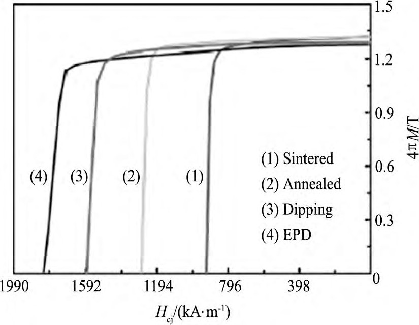 图3 不同工艺处理磁体的退磁曲线Fig.3 Demagnetization curves of magnets after different treat-ments[18]