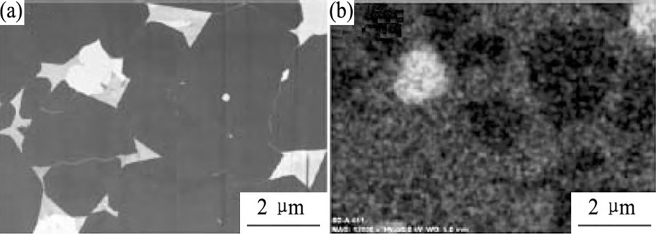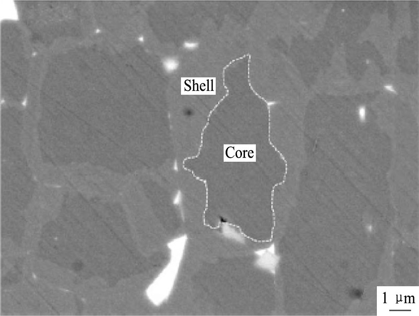 为了进一步改善晶界扩散效果, Soder6nik等[18]提出了一种电泳沉积改进的晶界扩散技术, 首先通过电泳沉积在磁体表面沉积一层表面平整光滑、厚度均匀可控的Dy F3层, 然后热处理进行晶界扩散。研究发现电泳沉积EPD Dy F3晶界扩散磁体的矫顽力较浸涂Dy F3晶界扩散磁体提高更显著 (图3) , 这主要因为形成了更加连续均匀分布的晶界富钕相。Cao等[19]获得了类似的研究结果。同样, Soder6nik等[20]研究了烧结钕铁硼磁体的EPD Tb F3晶界扩散, 指出通过低的重稀土含量能够使磁体的矫顽力提高至2000 k A·m-1以上, 这与磁体中核-壳微观结构的形成是密切相关的 (图4) 。