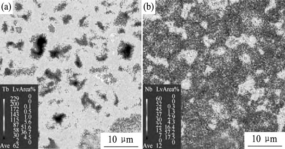 图5 Tb H3纳米颗粒晶界扩散后磁体200μm深处Tb和Nd的EPMA图Fig.5EPMA profiles of Tb (a) and Nd (b) taken from a portion of a magnet after grain boundary diffusion process with Tb H3nanoparticles at a depth of 200μm from surface[21]