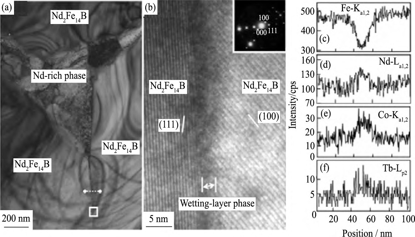 除了采用Dy或Tb的无机化合物, 重稀土金属也可以用来进行晶界扩散, 提高烧结钕铁硼磁体的矫顽力。Watanabe等[30,31]最早研究了小尺寸烧结钕铁硼磁体的Dy或Tb蒸汽吸附扩散处理, 发现磁体的矫顽力得到成功提高, 这主要是因为Tb沿磁体晶界发生了扩散, 并在晶界形成了薄而连续的非晶Co-Nd (Tb) 浸润层 (图7) 。Li等[8]和包小倩等[9]则通过磁体表面溅射Dy/Tb或蒸镀Dy的晶界扩散提高了晶粒外延层的各向异性场, 进而显著提高了磁体的矫顽力。此外, 包小倩等[9]计算模拟了Dy元素在晶界和主相晶粒内的扩散系数及相应的扩散曲线, 为晶界扩散提供了理论依据。