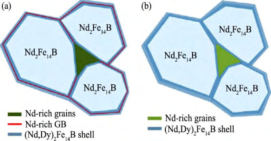 图9 GBDP磁体及其退火和水淬后的微观结构特征示意图Fig.9 Schematic of microstructure features of GBDP (a) and annealed and quenched GBDP (b) magnets[33]
