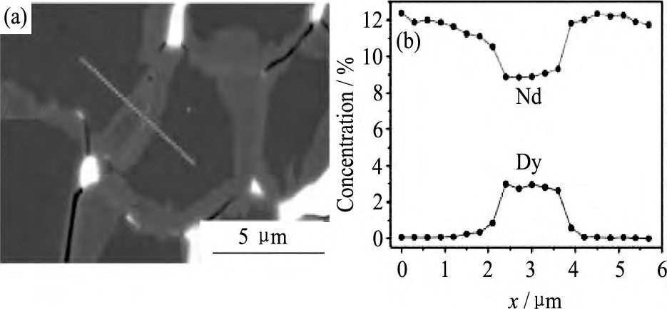 图1 0 Dy涂覆磁体900℃退火6 h后的横截面BSE SEM图像和相应的Dy和Nd含量的WDX线扫描Fig.10BSE SEM image of transverse section of a Dy-coated magnet after annealing at 900℃for 6 h (a) and cor-responding WDX line scan (b) [35]