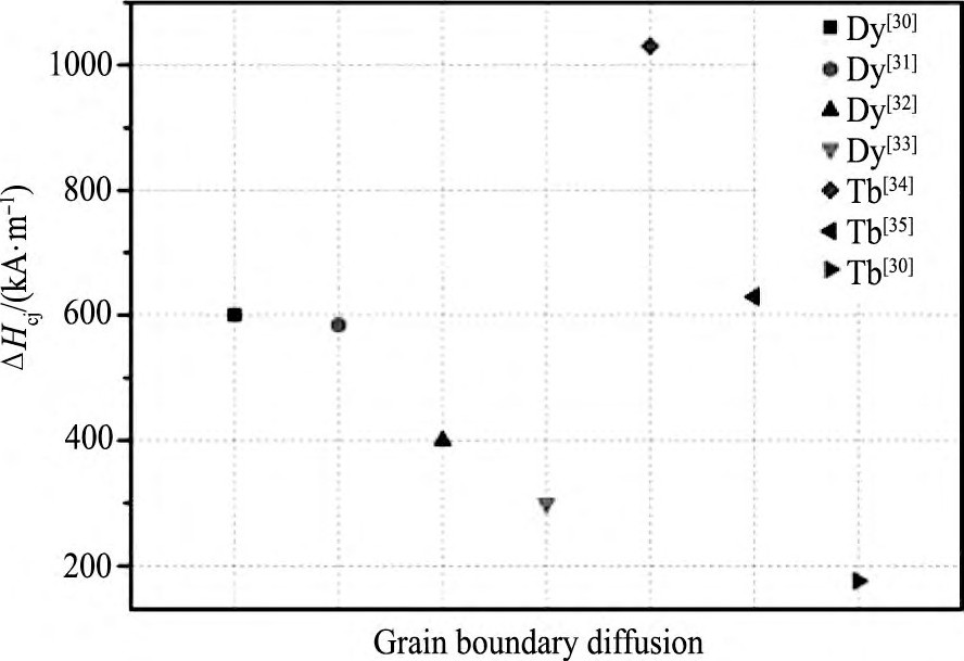 图1 1 稀土金属晶界扩散磁体的矫顽力增量Fig.11 Coercivity increment of magnets by grain boundary dif-fusion with rare earth metals[30,31,32,33,34,35]