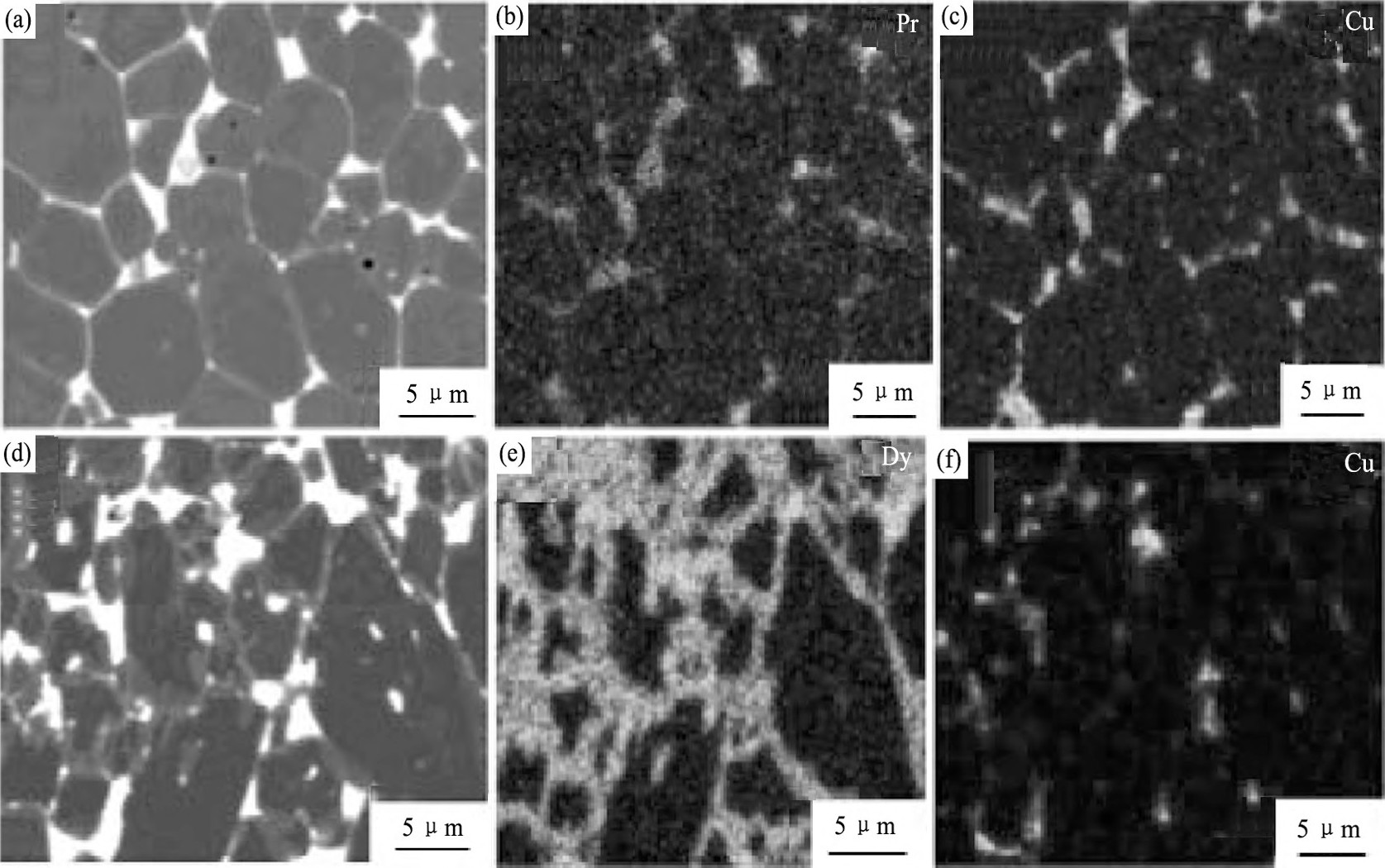 图1 2 Pr68Cu32和Dy70Cu30合金扩散处理样品的SEM图和Pr, Dy, Cu元素的EPMA图Fig.12 SEM images and EPMA mapping images of Pr, Dy and Cu elements for processed sample by Pr68Cu32 (a, b, c) and Dy70Cu30 (d, e, f) alloys[12]