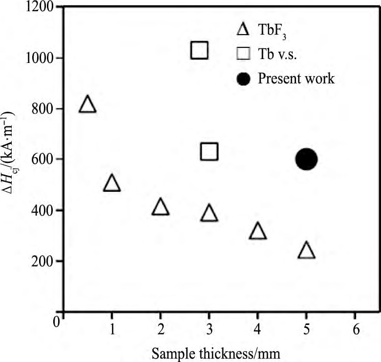 图1 3 晶界扩散处理后矫顽力增量与样品厚度的关系图Fig.13 A plot of coercivity improvement produced by various GBD treatments against sample thickness[40]