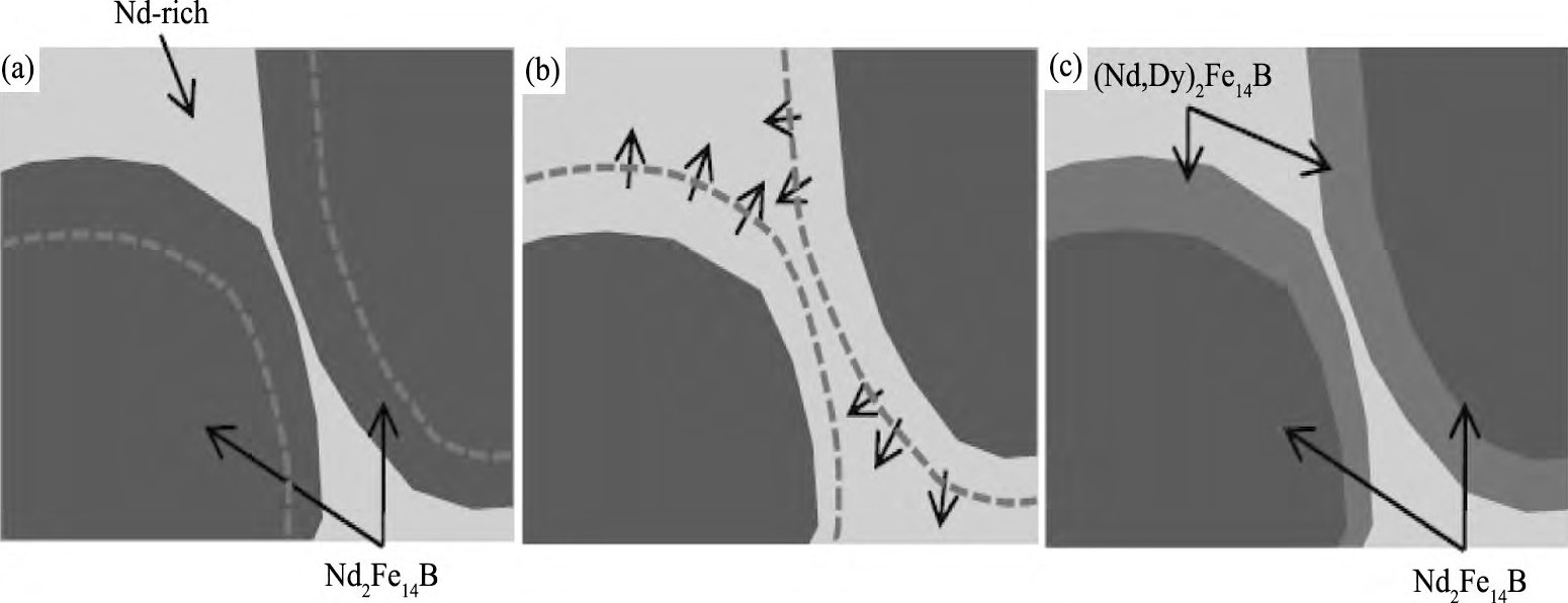 图1 4 Dy取代Nd的可能机制的示意图Fig.14 Schematic of a possible mechanism for replacement of Nd with Dy[40] (a) Before GBD treatment; (b) During annealing; (c) After diffusion annealing