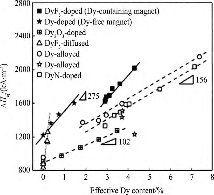 图1 6 不同工艺处理下有效Dy添加量 (质量分数) 与磁体矫顽力提高的关系Fig.16Coercivity enhancement as function of effective Dy content under different processing treatments[10]