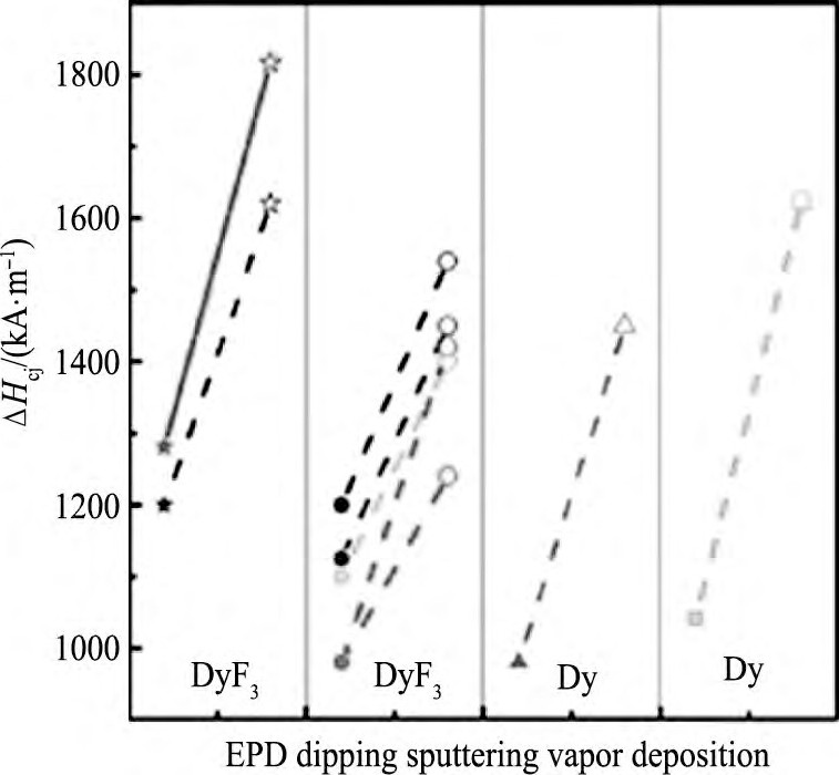 晶界扩散是提高磁体矫顽力的有效手段, 晶界扩散工艺相对晶界掺杂和合金化工艺更能够有效提高磁体的矫顽力 (图16) 。晶界扩散磁体中形成的核壳结构能够有效利用Dy元素, 这可能是其矫顽力提高更有效的原因[10]。但是, 不同的扩散工艺和扩散源物质对矫顽力的提高效率具有重要影响。在晶界扩散工艺中, 电泳沉积扩散方法处理磁体的矫顽力增加率要高于浸涂扩散和溅射扩散方法, 但是略低于蒸镀扩散方法 (图17) [19]。电泳沉积扩散方法能够获得更加连续均匀的晶界富钕相, 这是其处理磁体具有更高矫顽力的重要原因。另外, 在3种类别的晶界扩散源物质中, 稀土合金相较无机稀土化合物和稀土金属具有更高的扩散效率, 更利于提高矫顽力[39,40]。