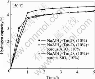 图1 NaAlH4-Tm2O3, NaAlH4-Tm2O3-SiO2和NaAlH4-Tm2O3- Al2O3体系150 ℃时的放氢曲线