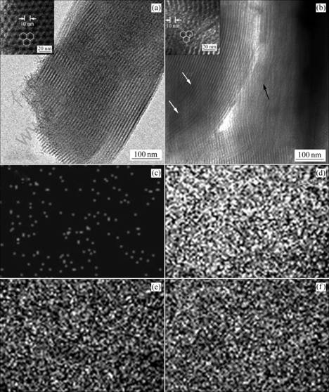 因制备得到的SiO2为介孔材料,孔径较小,为进一步研究NaAlH4-Tm2O3-SiO2体系球磨后的微观形貌,对其进行HRTEM检测,结果列于图5。图5(a)所示为制备得到的介孔氧化硅材料,其中插图为孔道材料的横截面,可看出SiO2孔道分布均匀有序,呈近似六方形结构,孔径约10 nm。图5(b)所示为NaAlH4- Tm2O3-SiO2体系经1 h球磨后的形貌,图中仍可看到完整的孔道,没有条纹状的模糊部分是受损的孔道(如图5(b)中黑色箭头所示)。ZHENG等[23]认为制备介孔SiO2约束的NaAlH4时,介孔SiO2中部分区域颜色变深,表示该区域孔道内负载了NaAlH4。本文作者观察到了一些颜色较深的区域(如图5(b)中白色箭头所示),推测这些区域中部分NaAlH4进到了孔道中,但具体含量未知。为了确定Tm2O3和NaAlH4在SiO2中的分布,对样品进行元素面扫描分析,图5(c)~(f)所示分别对应元素Tm、O、Na和Al,可观察到Tm、O、Na和Al元素在NaAlH4- Tm2O3-SiO2体系中的分布比NaAlH4-Tm2O3-Al2O3中的更加均匀,说明Tm2O3和NaAlH4的分散总体更均匀。NaAlH4均匀地分散在介孔SiO2的表面和内部,没有观察到团聚现象,这也使得NaAlH4-Tm2O3-SiO2体系的循环放氢性能优于NaAlH4-Tm2O3 和 NaAlH4-Tm2O3-Al2O3体系的,后二者皆有较大团聚产生。另外,大孔Al2O3和介孔SiO2相比,虽然二者皆有孔道,但由于Al2O3孔径较大(约200 nm),即便更多NaAlH4进到了孔内,相对于介孔SiO2,也不能够更好地将NaAlH4限制在一个较小的范围内从而减小材料间的传质距离,因此,添加介孔SiO2的体系表现出更好的循环放氢性能。同时,由于加入大孔Al2O3未能使NaAlH4分散更加均匀,且产生了团聚,增大了材料的传质距离,因此,第2~5次的循环放氢性能NaAlH4-Tm2O3-Al2O3 甚至还弱于NaAlH4- Tm2O3体系。