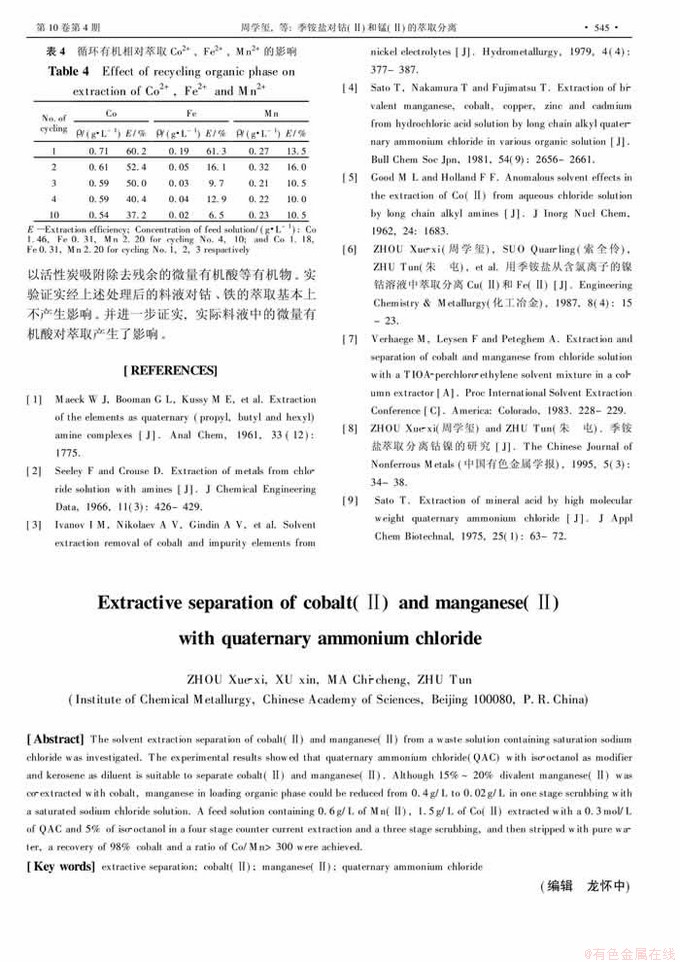 Key words:extractive separation; cobalt(Ⅱ); manganese(Ⅱ); quaternary ammonium chloride