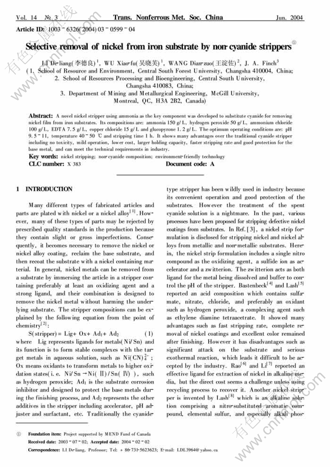 论文作者:李德良 吴晓芙 王淀佐 J.A.Fjnch