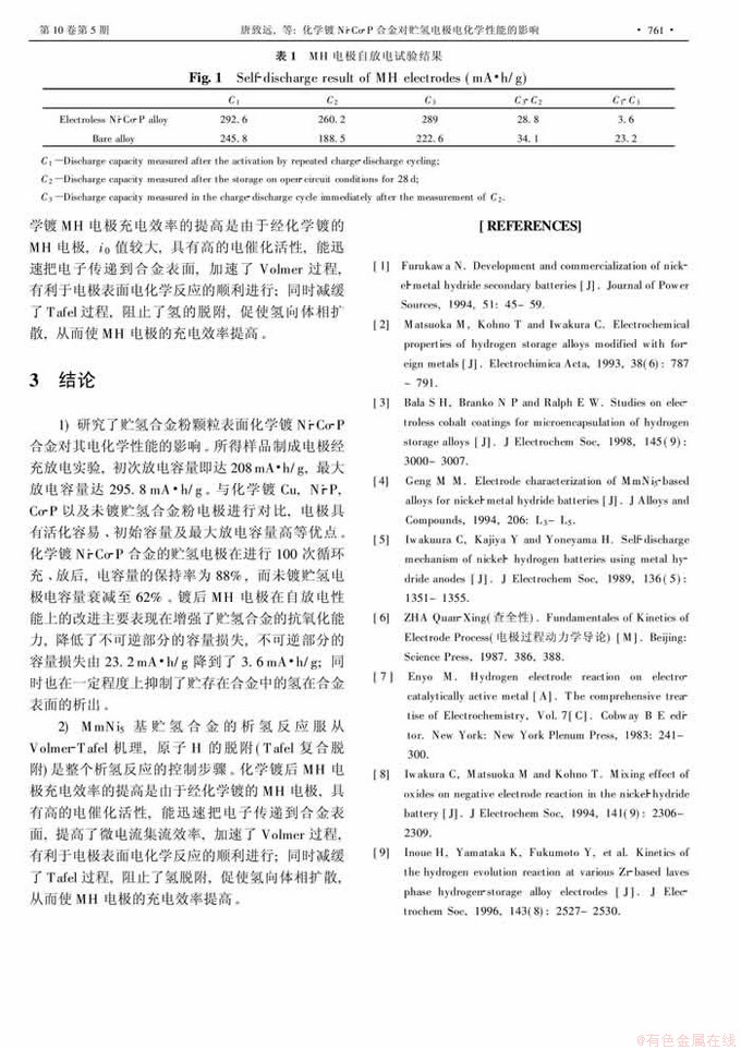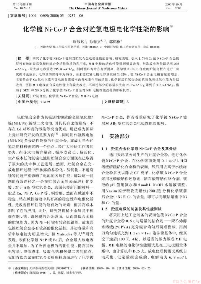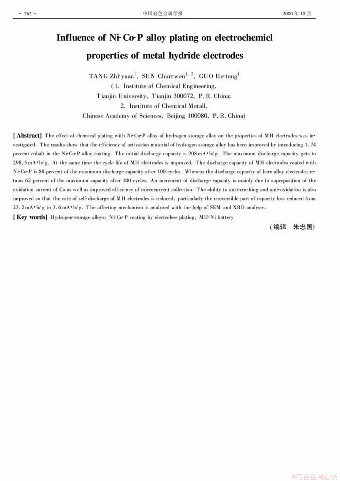 Key words:Hydrogen-storage alloys; Ni-Co-P coating by electroless plating; MH-Ni battery