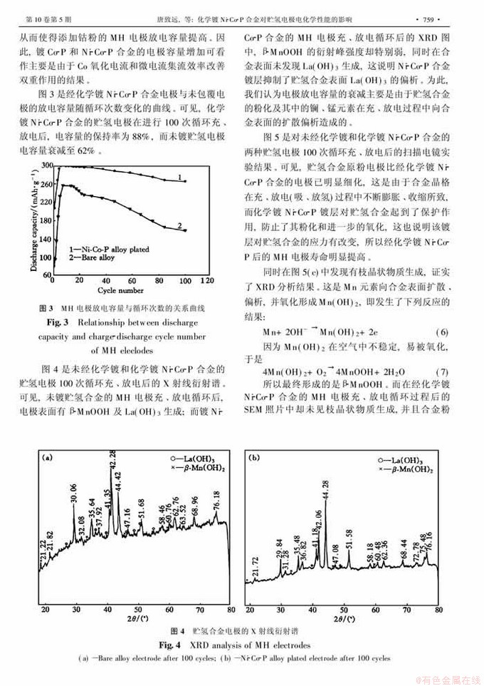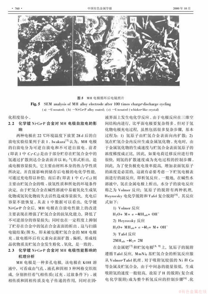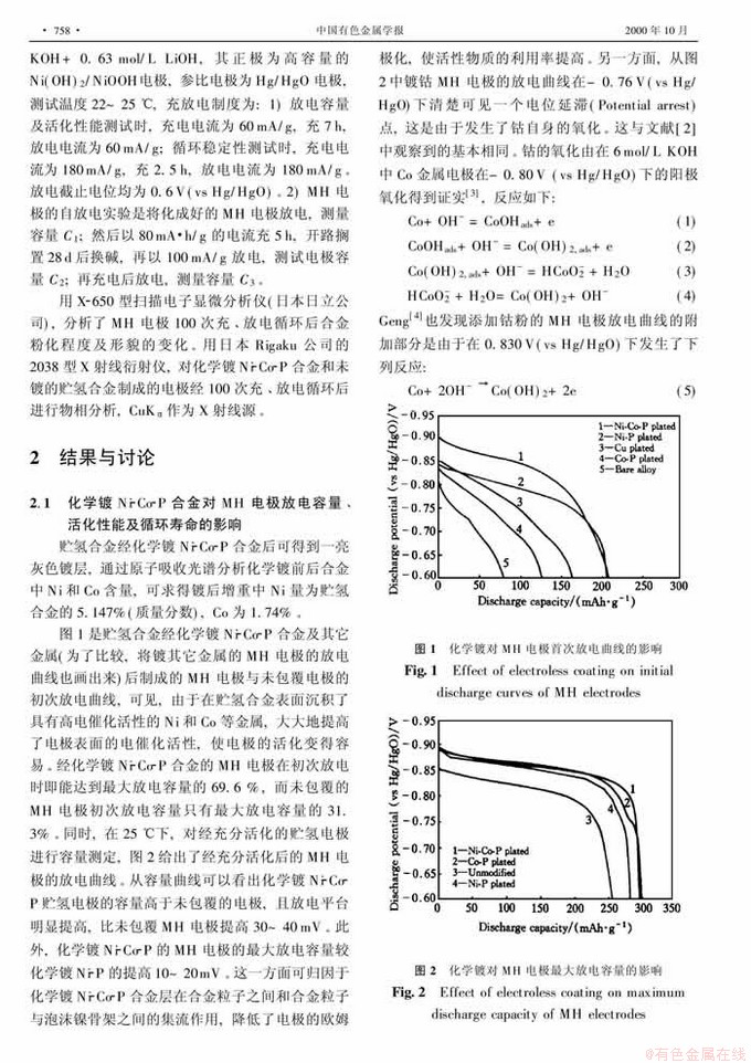 关键词:贮氢合金; 化学镀Ni-Co-P合金; MH-Ni电池