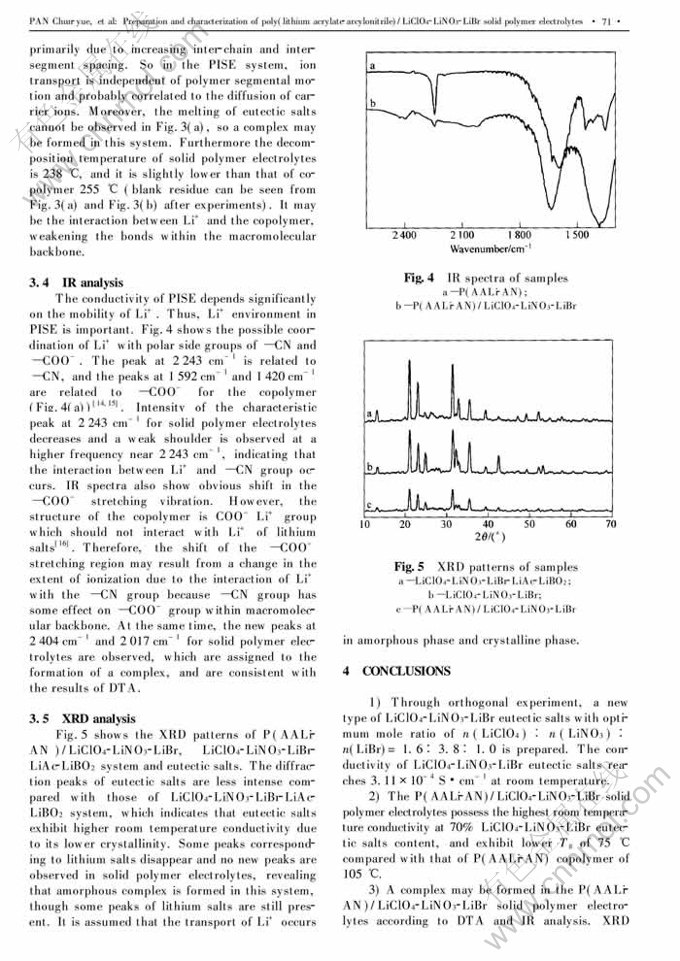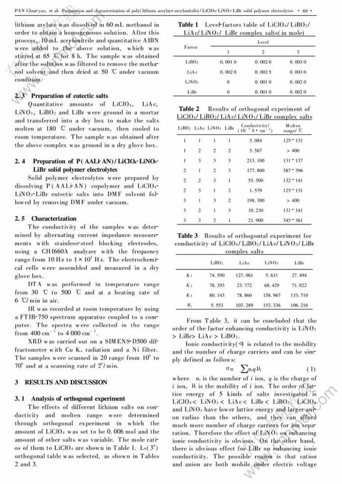 Key words:solid polymer electrolyte; conductivity; eutectic salt; LiClO4; LiNO3; LiBr; arcylonitrile