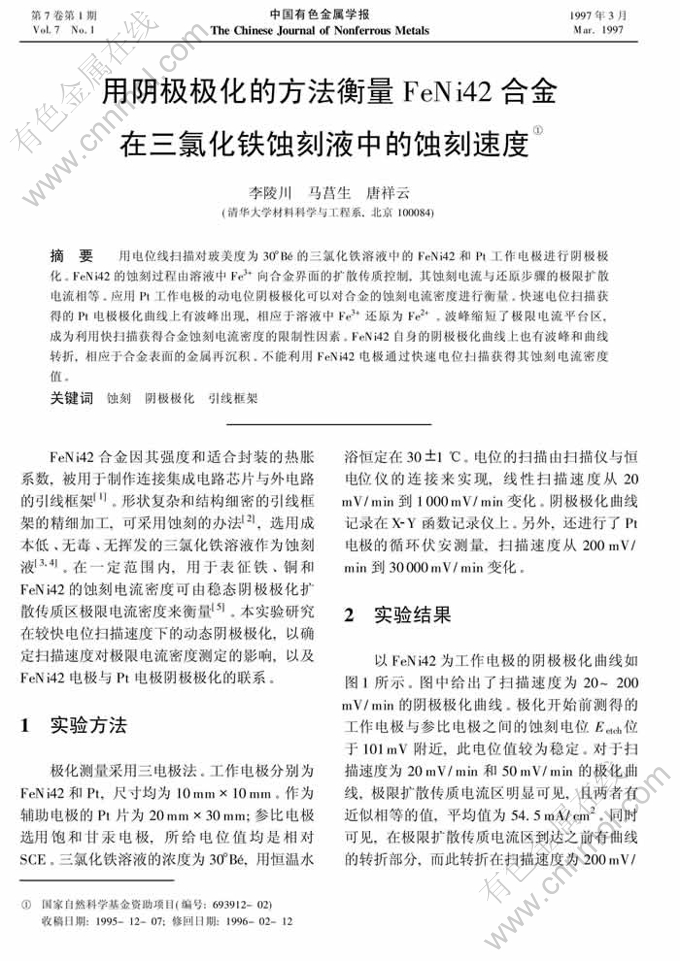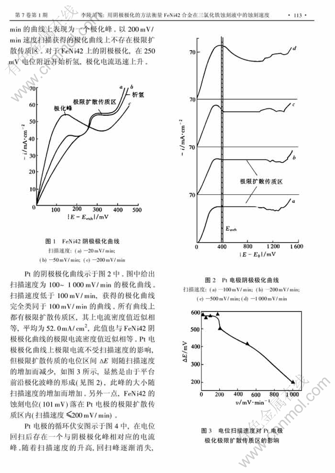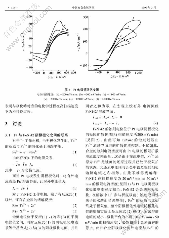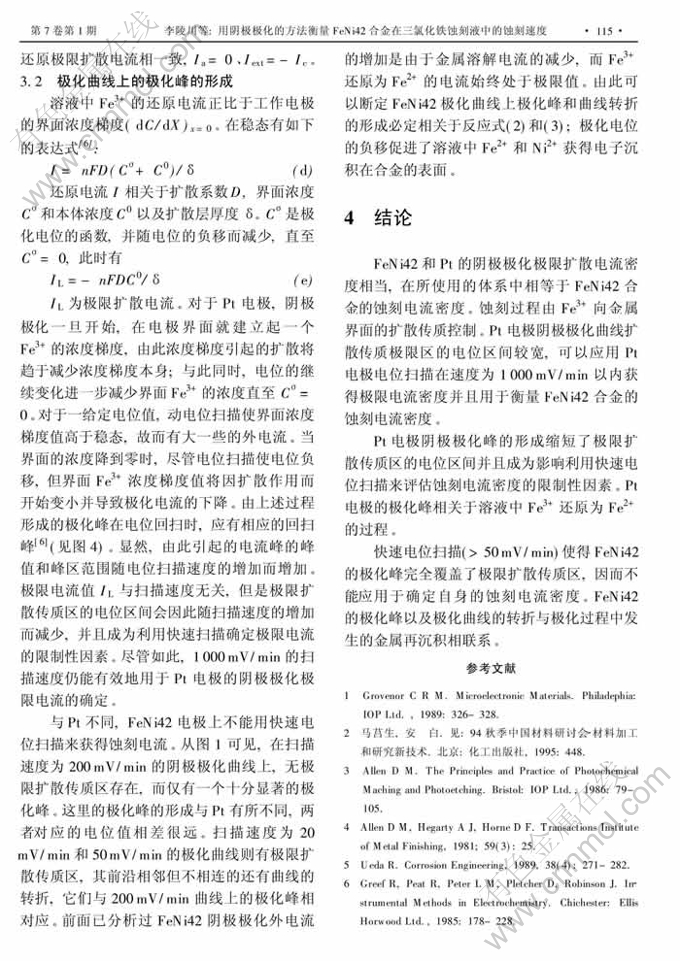 摘 要:用电位线扫描对玻美度为30°Bé的三氯化铁溶液中的FeNi42和Pt 工作电极进行阴极极化。 FeNi42的蚀刻过程由溶液中Fe3+向合金界面的扩散传质控制, 其蚀刻电流与还原步骤的极限扩散电流相等。 应用Pt 工作电极的动电位阴极极化可以对合金的蚀刻电流密度进行衡量。快速电位扫描获得的Pt 电极极化曲线上有波峰出现,相应于溶液中Fe3+还原为Fe2+。波峰缩短了极限电流平台区,成为利用快扫 描获得合金蚀刻电流密度的限制性因素。FeNi42自身的阴极极化曲线上也有波峰和曲线转折,相应于合金表面的金属再沉积。不能利用FeNi42电极通过快速电位扫描获得其蚀刻电流密度值。