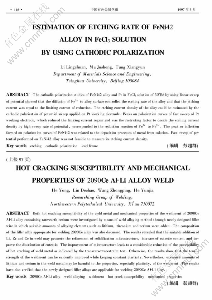 Abstract: The cathodic polarization studies of FeNi42 alloy and Pt in FeCl3 solution of 30°Bé by using linear sweep of potential showed that the diffusion of Fe3+ to alloy surface controlled the etching rate of the alloy and that the etching current was equal to the limiting current of reduction. The etching current density of the alloy could be estimated by the cathodic polarization of potential sweep applied on Pt working electrode. Peaks on polarization curves of fast sweep of Pt working electrode, which reduced the limiting current region and was the restricting factor to decide the etching current density by high sweep rate of potential , corresponded to the reduction reaction of Fe3+ to Fe2+. The peak or inflection formed on polarization curves of FeNi42 was related to the deposition processes of metal from solution. Fast sweep of potential performed on FeNi42 alloy was not feasible to measure its etching current density.