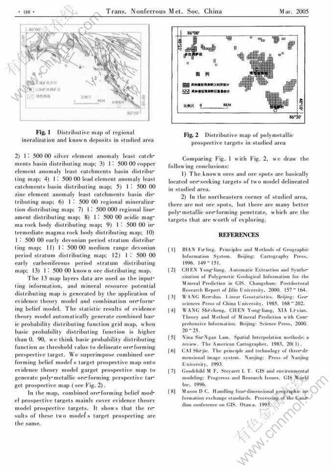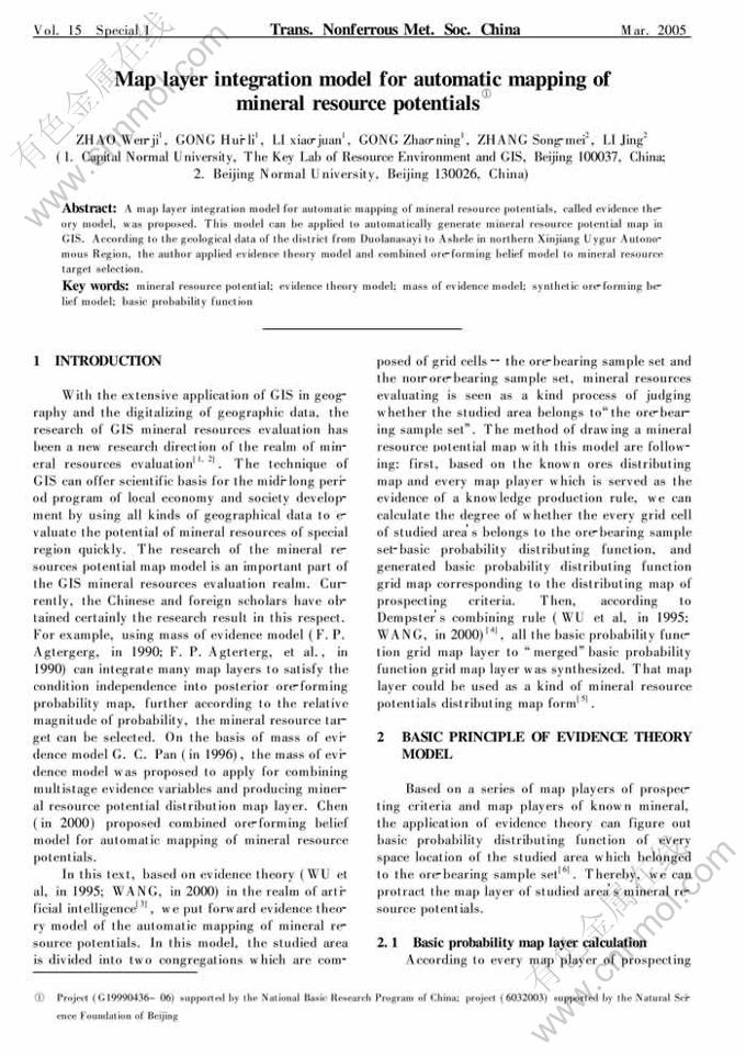 Abstract: A map layer integration model for automatic mapping of mineral resource potentials, called evidence theory model, was proposed. This model can be applied to automatically generate mineral resource potential map in GIS. According to the geological data of the district from Duolanasayi to Ashele in northern Xinjiang Uygur Autonomous Region, the author applied evidence theory model and combined ore-forming belief model to mineral resource target selection.