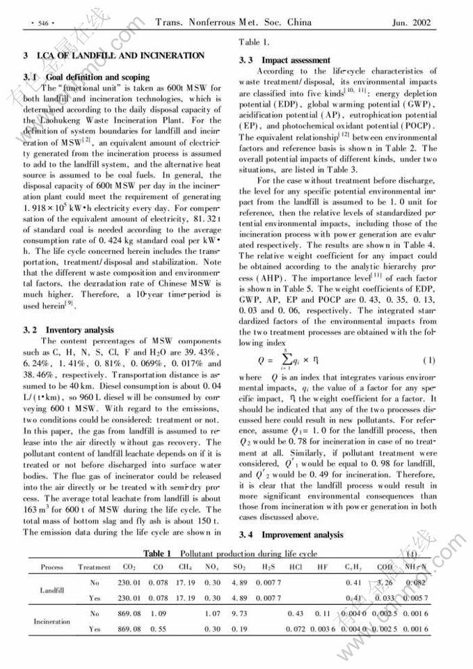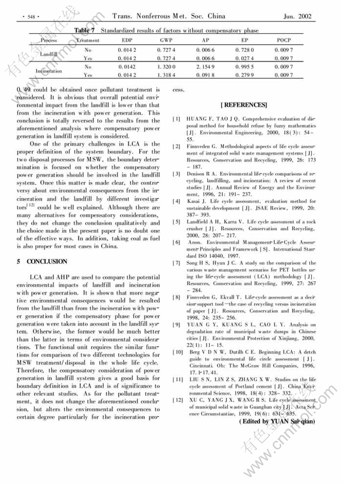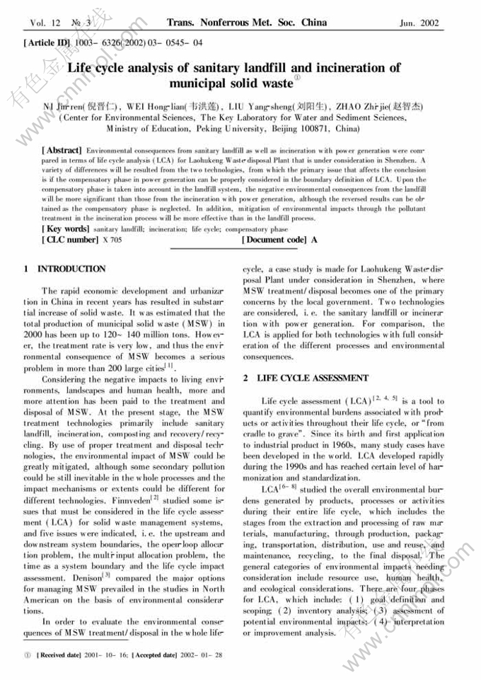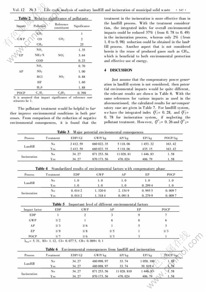 Key words:sanitary landfill; incineration; life cycle; compensatory phase