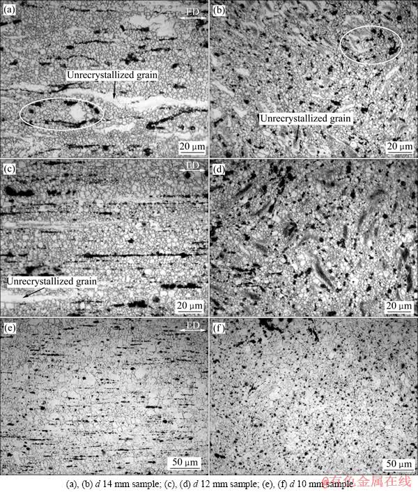 2) 挤压力一定时,挤压比越大,挤压应变速率越小,再结晶晶粒受温度影响越大,晶粒长大越明显,d 14 mm、d 12 mm和d 10 mm试样平均晶粒尺寸分别为2.7、2.4和5.9 μm。