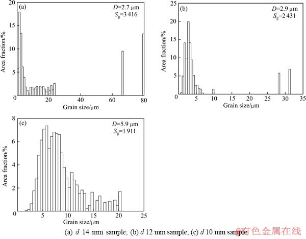 由晶粒尺寸分布统计图(见图3(a),图中Sg为晶粒统计数量)可知,d 14 mm试样具有双峰晶粒分布特征,这种组织特征在挤压镁合金中经常被观察到[10-11]。试样平均晶粒尺寸约为2.7 μm,其中约有98.8%的晶粒尺寸小于10 μm,面积分数为54.0%。未再结晶区域面积分数约为31.0%。与d 14 mm试样对比,随着挤压比的提高,合金中未再结晶区域面积分数减小,d 12 mm试样中约为14.2%(见图3(b)),而d 10 mm试样为0.9%(见图3(c))。然而,随着挤压比增加平均晶粒尺寸增大,d 10 mm试样晶粒平均尺寸约为5.9 μm。