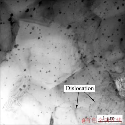 式中:Q为激活能;R为摩尔气体常数;k和b均为常数。由式(2)和(3)可知,当温度一定时,如果应变速率较慢,则再结晶晶粒受高温影响越大,晶粒容易长大。d 10 mm试样挤压时应变速率过小,再结晶晶粒在挤压过程中长大而粗化。然而,其晶粒长大并不显著,平均尺寸小于6 μm,这主要是由于在热挤压过程中从基体析出了大量纳米级的沉淀相(见图5),这些沉淀颗粒对晶界有较强的钉扎作用,可以有效阻碍晶界移动,抑制晶粒长大。总之,若要获得均匀的细晶组织,挤压应该在相对较高的应变速率下进行。