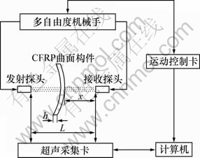 碳纤维复合材料(CFRP)具有高强度、高硬度和低密度等优越性能,被广泛应用于航空航天、军工、能源等领域[1]。由于其具有独特的制造工艺,在制造的过程中容易形成孔隙、脱粘、分层等缺陷,这些缺陷的存在积累到一定程度就会造成构件性能急剧下 降[2]。随着CFRP的大量应用,其潜在的安全隐患也逐渐显露[3]。可见,准确检测CFRP的内部缺陷尤显迫切。超声无损检测是CFRP内部缺陷的重要检测手段[4],其中脱粘和分层缺陷比较容易检出[5],但检测孔隙缺陷是CFRP超声检测方法中的难点,国内外学者对此开展了大量的研究,如采用衰减法[6]、声阻抗法[7]和背散射法[8]等。现有研究普遍针对标准试件和具有规则几何形状的CFRP构件,且检测的自动化程度不高。而实现复杂型面构件的超声检测,需要充分利用机器人技术、自动控制技术、计算机技术、信号处理技术、CAD/CAM等技术领域的前沿研究与无损检测技术有机结合,这是近年来国内外超声无损检测领域的热点问题与前沿课题[9]。本文作者基于超声测量、建模及检测一体化的思想,通过信号分析建立相速度-孔隙率的超声检测模型,研究一种CFRP复杂型面构件孔隙率自动检测方法。
