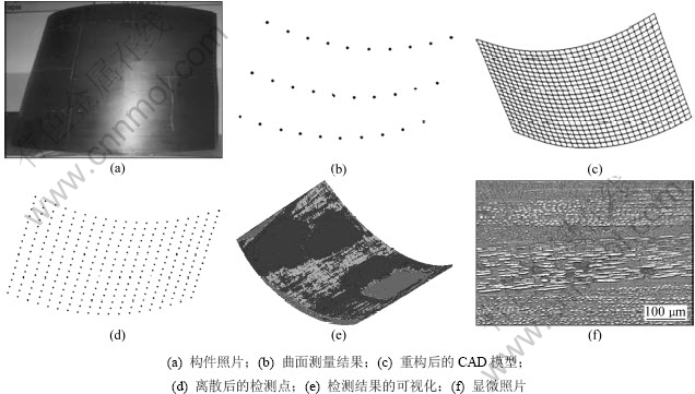 对如图5(a)所示的CFRP复杂型面构件进行试验,首先通过超声测距采集构件表面上的三维坐标,曲面测量结果见图5(b)。然后采用曲面蒙皮方法对测量数据进行CAD模型重构,结果如图5(c)所示。再将曲面离散成有限个检测点,见图5(d)。每个检测点对应1个小图元,在实时超声信号采集时,进行相位展开法计算出每个检测点所对应的超声相速度,并结合已建立的相速度-孔隙率模型获取其孔隙率,最后利用调色板技术对图元进行“着色”,实现CFRP复杂型面构件孔隙率的可视化,检测结果见图5(e)。