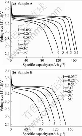 图5所示为采用样品A和B 作为正极材料制作的锂离子电池的放电曲线。由图5(a)可以看出,电池的放电平台为3.4 V,放电曲线非常平坦。电池在0.05C倍率下的放电容量为170 mA?h/g,几乎达到了LiFePO4的理论容量。这与其结构有非常重要的联系,由于原料气化后进行反应,反应过程完全,形成的LiFePO4属于完整的橄榄石型结构,Li+在LiFePO4中的可逆性好,又由于所包覆的碳膜厚度为5~10 nm,碳的晶体结构好,其导电性好,使每个LiFePO4颗粒中的Li+都能够嵌入和脱出,因此使其容量达到理论值。进一步考察材料的倍率放电性能,发现电池的1C放电容量可以达到141 mA?h/g,保持理论容量的83%;2C和5C倍率下的放电容量分别能保持理论容量的77%和62%。这是因为样品A的LiFePO4颗粒大小为50~200 nm,颗粒越小,Li+的嵌入和脱出时间越短,其大倍率放电性能越好。