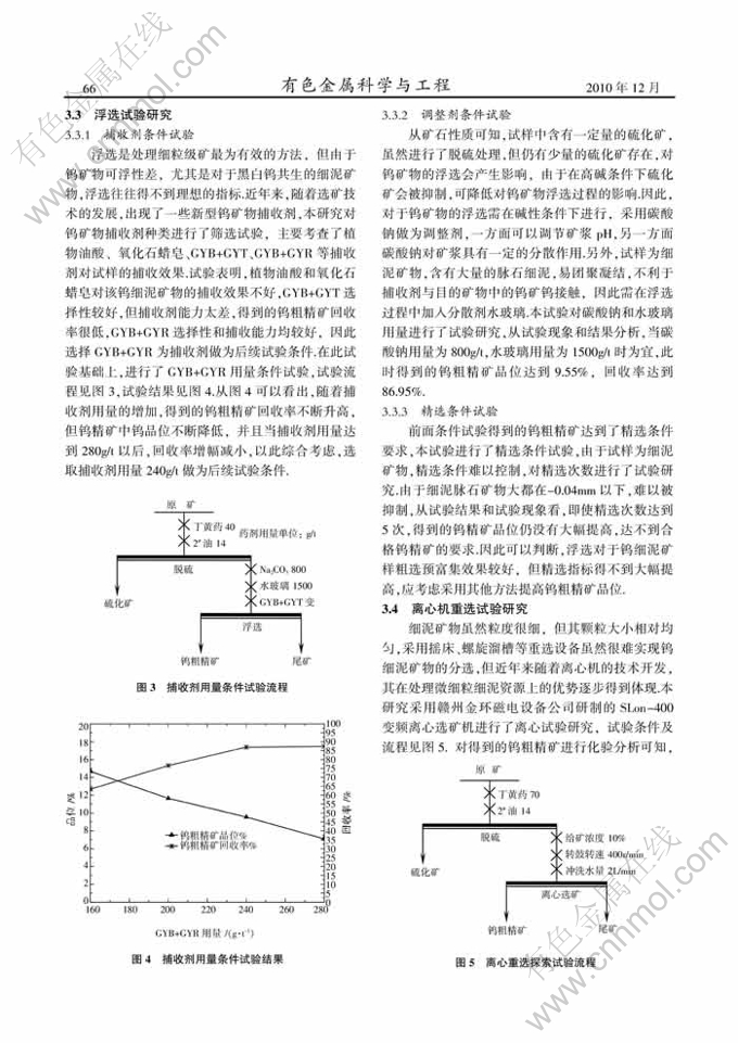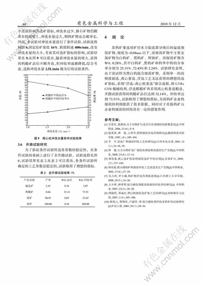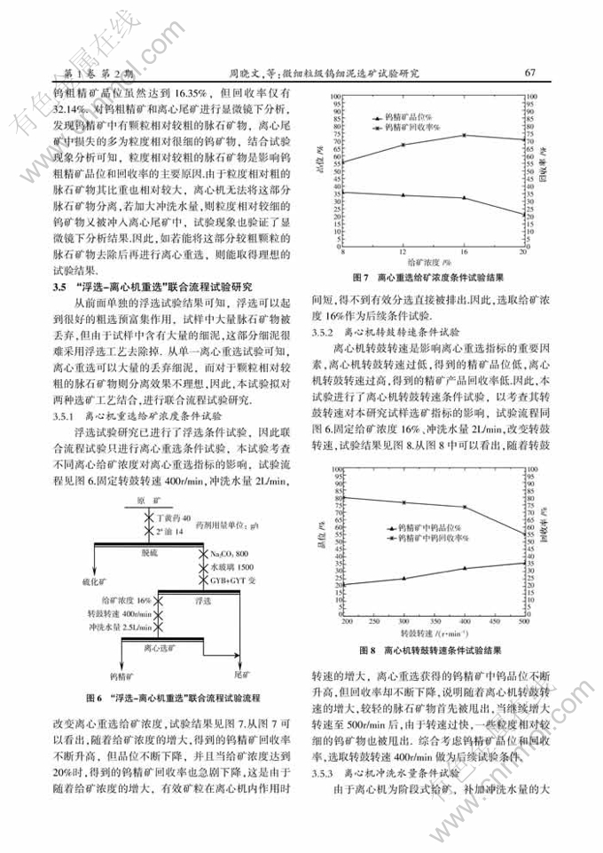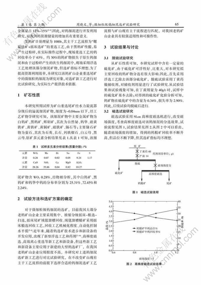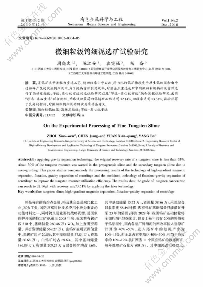 Key words:fine tungsten slime; high-gradient magnetic separation; flotation-gravity separation of centrifuge