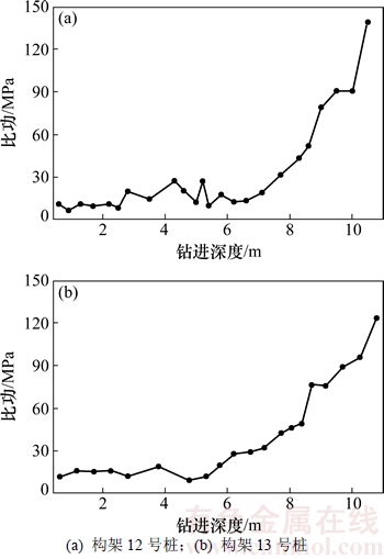 为验证地层识别系统的有效性,对站内其他68根旋挖桩随钻参数实施动态监测,并计算比功随钻进深度的实时变化曲线。以构架基础12号桩和13号桩为例,钻深10.0 m时随钻参数如表2所示,比功-深度曲线如图4所示。由图4可见:在进尺8.5 m深度处,12号桩的比功达到60 MPa,钻头抵达岩层;在10.0 m深度处,13号桩的比功达到100 MPa,应为中风化持力层。根据场地勘察资料,结合超前钻探、试桩取土观察、钻孔钻进速度分析及对比成孔负载功率等分析方法,对68根旋挖桩地层比功预测结果进行校核,持力层判断的准确率高于95%。上述一桩一孔样本建立的比功-地层置信区间,经过大量桩孔的反复调整、验证,可获得地层理想的预测输出。