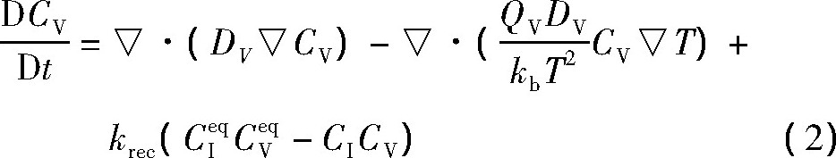 式中下标I和V分别代表自间隙与空位, t为时间, CI, CV分别代表自间隙与空位浓度, CIeq, CVeq分别代表自间隙与空位的平衡浓度, DI, DV分别为自间隙与空位的扩散系数, QI, QV分别为自间隙与空位热扩散激活焓;krec为动力学重组因子, kb代表玻尔兹曼常数, T为温度, r为热扩散因子;HIm与HVm分别代表自间隙与空位的迁移焓;GIf, GVf分别为形成自间隙与空位的吉布斯自由能, HIf, HVf分别为自间隙与空位形成焓, SIf, SVf分别表示自间隙与空位形成熵。上述点缺陷控制方程在S-D模型 (Sinno与Dornberger建立的点缺陷控制模型) 的基础上充分考虑QI与QV对热传递及点缺陷扩散的影响, 其他参数与S-D模型保持一致。
