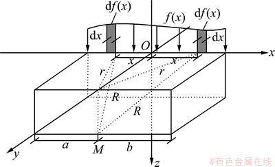 地基受非均布线形荷载作用的力学模型见图2。当地基表面作用于一非均布的线形荷载P=f(x)时,梁中间垂直于梁轴线平面内的地基中深度z处的M点的应力和位移计算公式可采用微元和应力叠加原理推导得出: