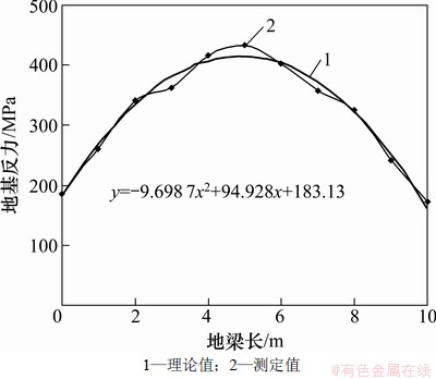 采用双参数地基模型计算地基反力,如图6所示。将计算的各点地基反力用二次多项式拟合,得到地基反力(y)与梁长度(x)之间的关系式为