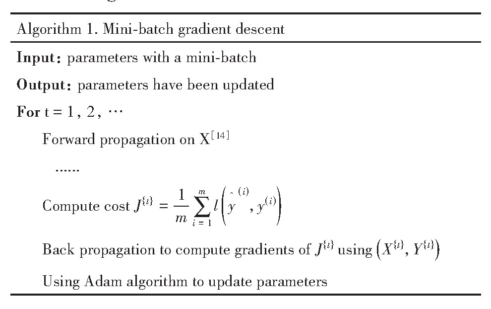 本文所用数据样本量较大,传统Batch梯度下降法迭代速度慢,随机梯度下降法参数更新不稳定,本文采用mini-batch梯度下降法,经过实验,每个mini-batch样本容量设置为64时最为理想,算法细节见算法1,见表3。